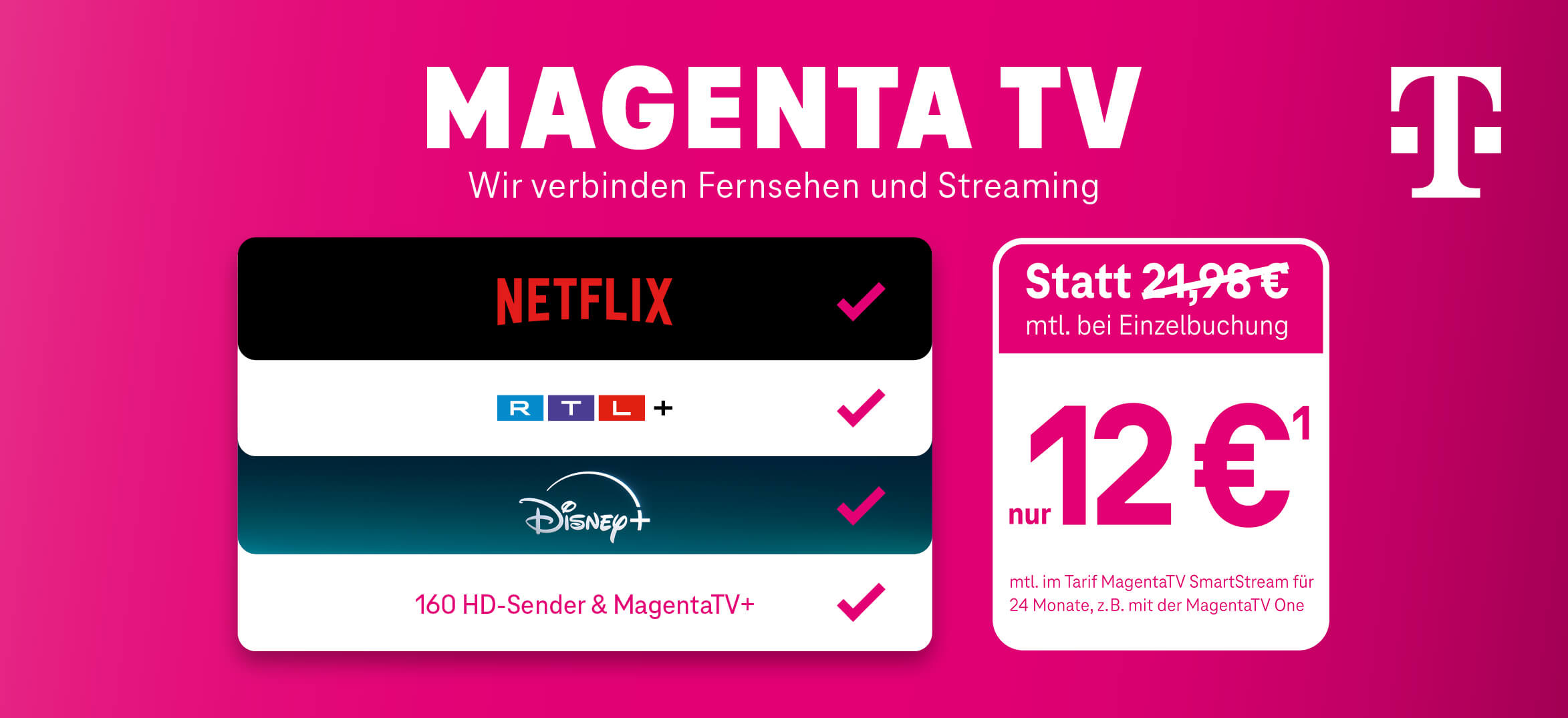 1) Aktion gilt bis 16.02.2026 für MagentaTV Neukunden. MagentaTV SmartStream kostet in den ersten 6 Monaten 0 €/Monat, vom 7.–24. Monat 12 €/Monat und danach 17 €/Monat. Mindestvertragslaufzeit 24 Monate. MagentaTV ist über die MagentaTV App ohne zusätzliche Hardware empfangbar. Auf Wunsch kann die TV-Box MagentaTV One für 5 €/Monat, zzgl. 6,95 € Versandkosten, mit einer Mindestvertragslaufzeit von 12 Monaten gemietet werden. Alle Preise inkl. der gesetzlichen MwSt. MagentaTV SmartStream enthält RTL+ Premium, Netflix Standard mit Werbung und Disney+ Standard mit Werbung (jeweils HD verfügbar). Voraussetzung für die Nutzung von Netflix und Disney+ sind die Registrierung und Akzeptanz der Nutzungsbedingungen und Datenschutzbestimmungen bei Netflix International B.V. und Disney+. Voraussetzung für die Nutzung ist eine bestehende Internetverbindung. Für die Internetverbindung gelten die Bedingungen des jeweiligen Internetanbieters. Bei Nutzung über das Mobilfunk-Datennetz erfolgt die Belastung des Datenvolumens beim jeweiligen Mobilfunk-Anbieter.